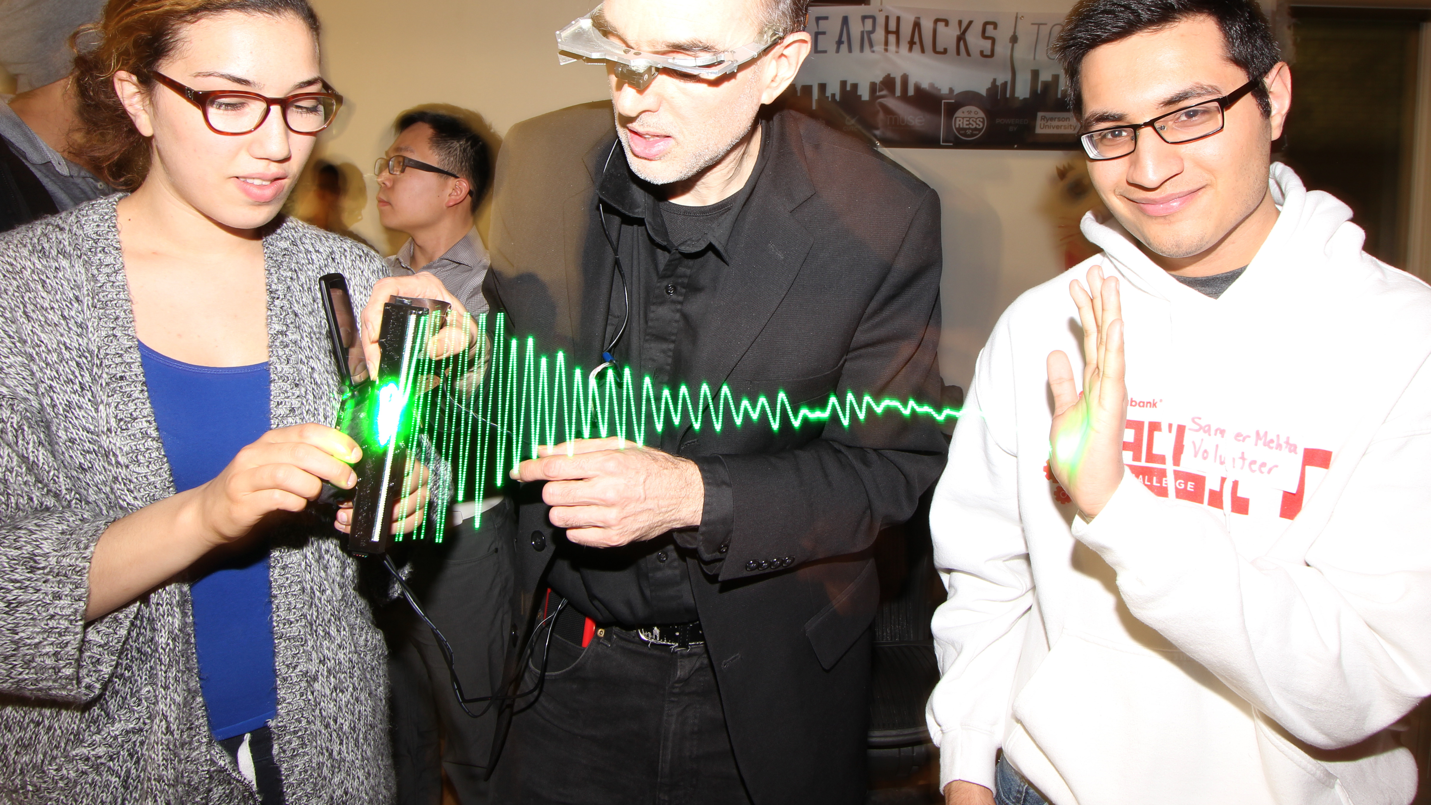Among many live demos was the S.W.I.M. (Sequential Wave Imprinting Machine) wearable computing and augmented reality system Mann originally built at the age of 12, back in 1974, to measure the speed of light and the speed of sound, and, more importantly, to express radio waves in a coordinate system that moves at the speed of light, with the waves, so as to make them appear to sit still (or at the speed of sound for sound waves), as Phenomenological AR (Augmented Reality) overlays.