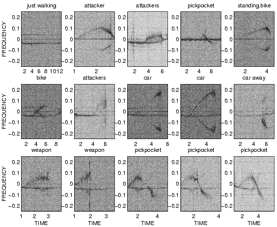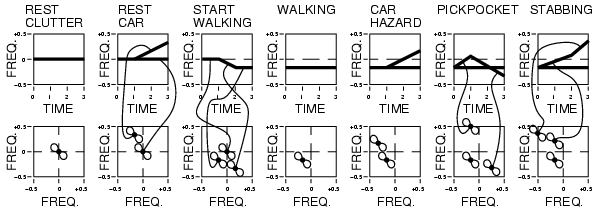 Fig. CAPTION: REST CLUTTER: radar return when the author (wearing the radar) is standing still; REST CAR: a stopped car is set in motion by stepping on the accelerator, so that a roughly constant force of the engine is exerted against the constant mass of the car, while the author (wearing the radar) is standing still. START WALKING: The author stands still for one second, and then decides to start walking. The decision to start walking is instantaneous, but the human body applies a roughly constant degree of force to its constant mass, causing it to accelerate until it reaches the desired walking speed, which takes approximately 1 second. Finally the author walks at this speed for another one second. All of the clutter behind the author (e.g. the ground, buildings, lamp posts, etc.) is moving away from the author, so it moves into negative frequencies. WALKING: at a constant pace, all of the clutter has a constant (negative) frequency. CAR HAZARD: while the author is walking forward, a parked car is switched into gear at time 1 second. It accelerates toward the author. The system detects this situation as a possible hazard, and brings an image up on the screen. PICKPOCKET: rare but unique radar signature of a person lunging up behind the author and then suddenly switching to a decelerating mode (at time 1 second), causing reduction in velocity to match that of the author (at time 2 seconds) followed by a retreat away from the author. STABBING: acceleration of attacker's body toward author, followed by a swing of the arm (initiated at time 2 seconds) toward the author.