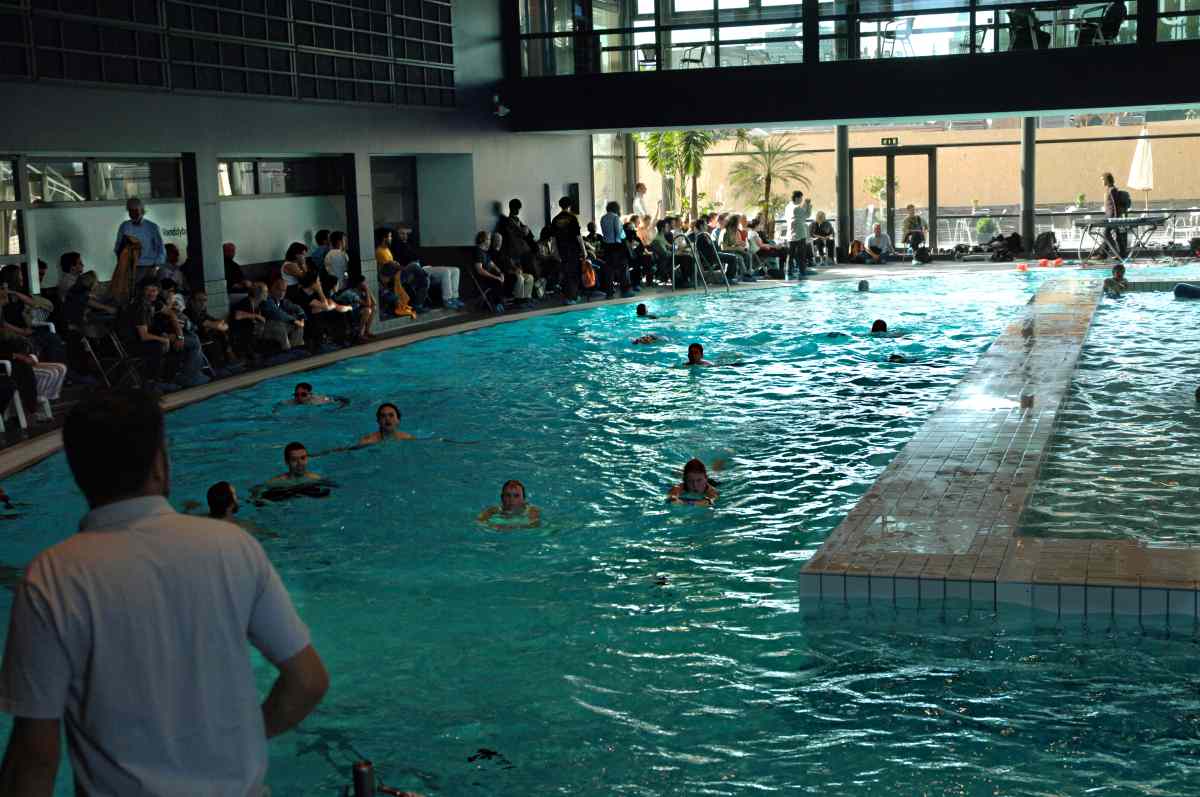 Some audience members immersed in water; some in air: