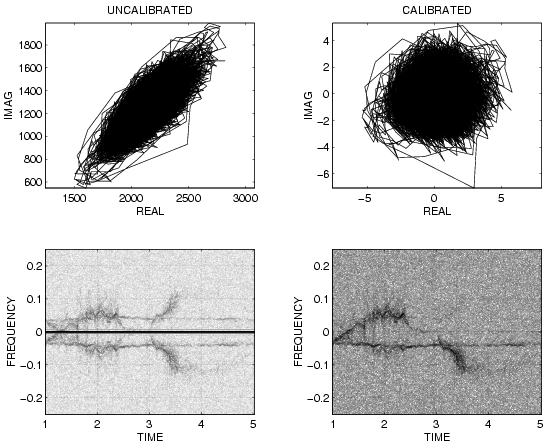 CAPTION: The author's homebrew radar generates a great deal of distortion. Notice, for example, that a plot of real versus imaginary data shows a strong correlation between real and imaginary axes, as well as an unequal gain in the real and imaginary axes respectively (note also the unequal signal strength of REAL and IMAG returns in the previous figure as well). Note also the DC offset which gives rise to a strong signal at f=0, even though there was nothing moving at exactly the same speed as the author (e.g. nothing that could have given rise to a strong signal at f=0). Rather than trying to calibrate the radar exactly, and to remove DC offset in the circuits (all circuits were DC coupled), and risk losing low frequency components, these problems were mitigated by applying a calibration program to the data. This procedure subtracted the DC offset inherent in the system, and computed the inverse of the complex Choleski factorization of the covariance matrix (e.g. covz defined as covariance of real and imaginary parts), which was then applied to the data. Notice how the CALIBRATED data forms an approximately isotropic circular blob centered at the origin when plotted as REAL versus IMAGinary. Notice also the removal of the mirroring in the FREQ=0 axis in the CALIBRATED data, which was quite strong in the UNCALIBRATED data.