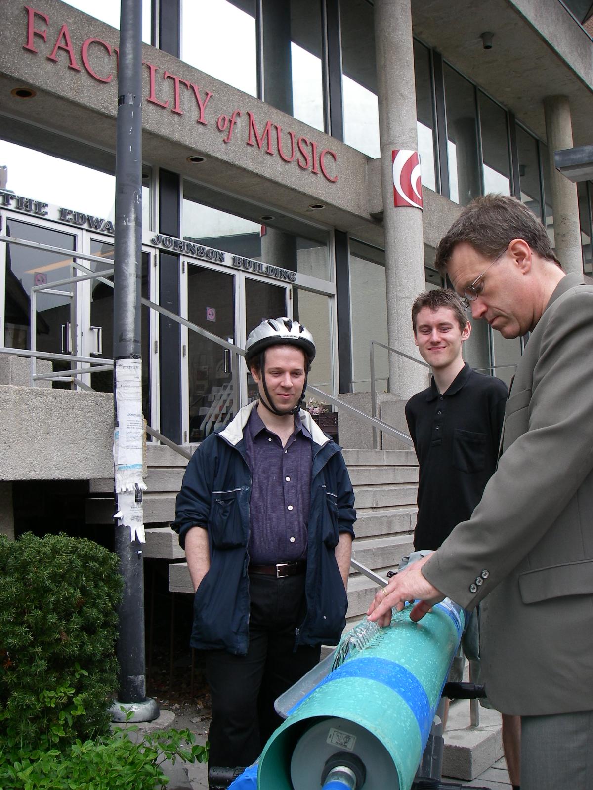 Thursday afternoon, 2006 May 4th, showing the Hydraulophone to Gage Averill and others at the Faculty of Music
